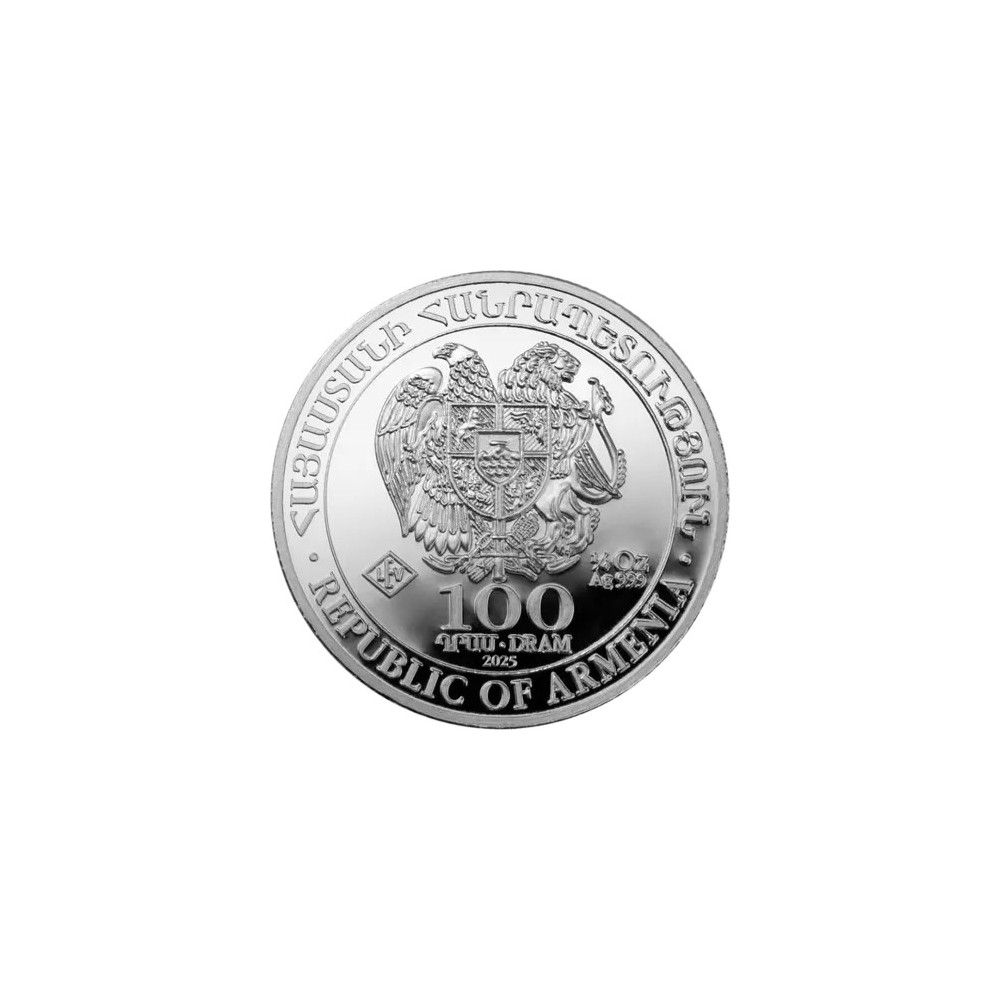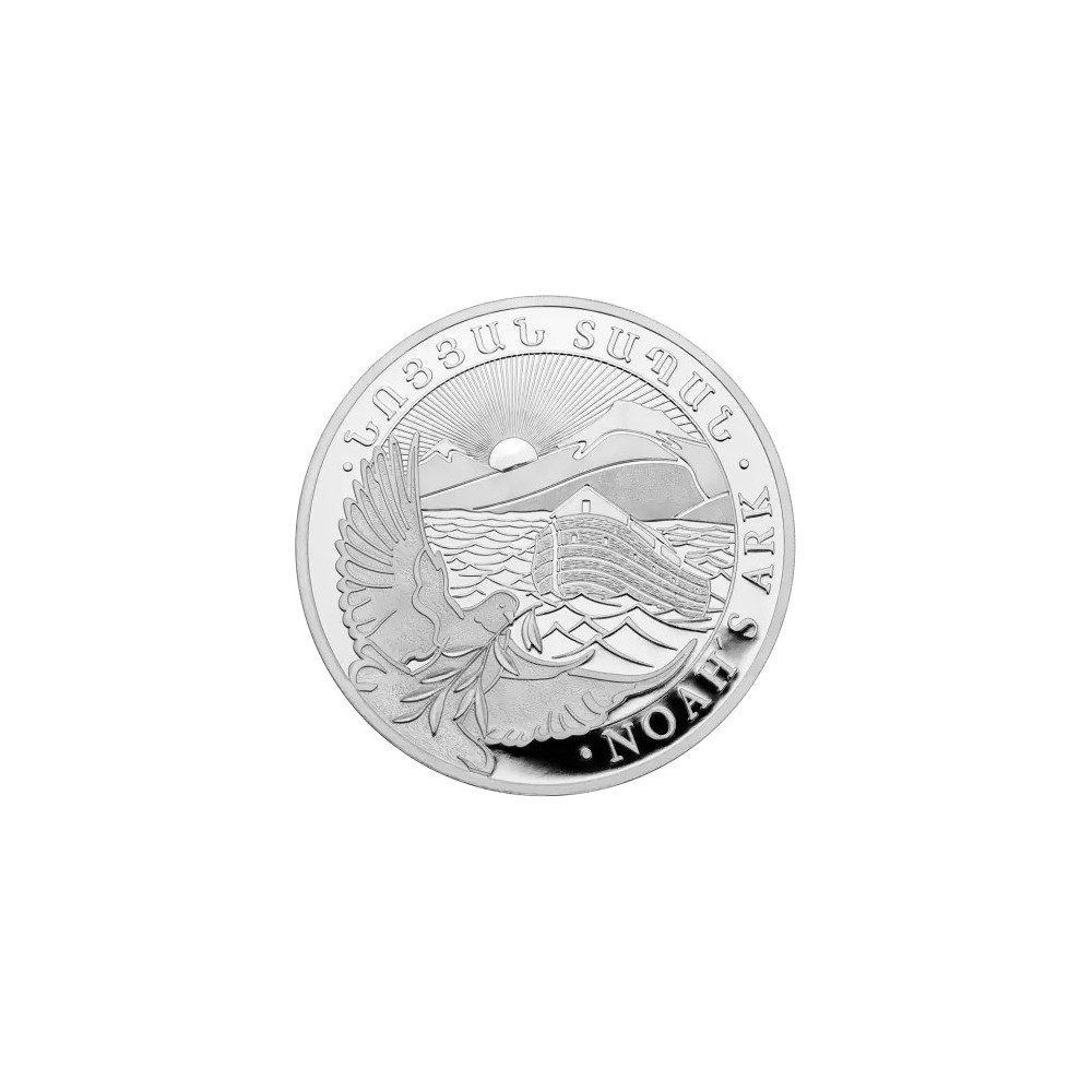 Il rovescio della moneta raffigura l'iconico atterraggio dell'Arca di Noè sul Monte Ararat, a pochi chilometri dall'Armenia. In primo piano c'è una colomba in volo con un ramo d'ulivo nel becco, a simboleggiare la fine del Diluvio. L'intera scena è circondata da un'iscrizione in inglese e armeno.