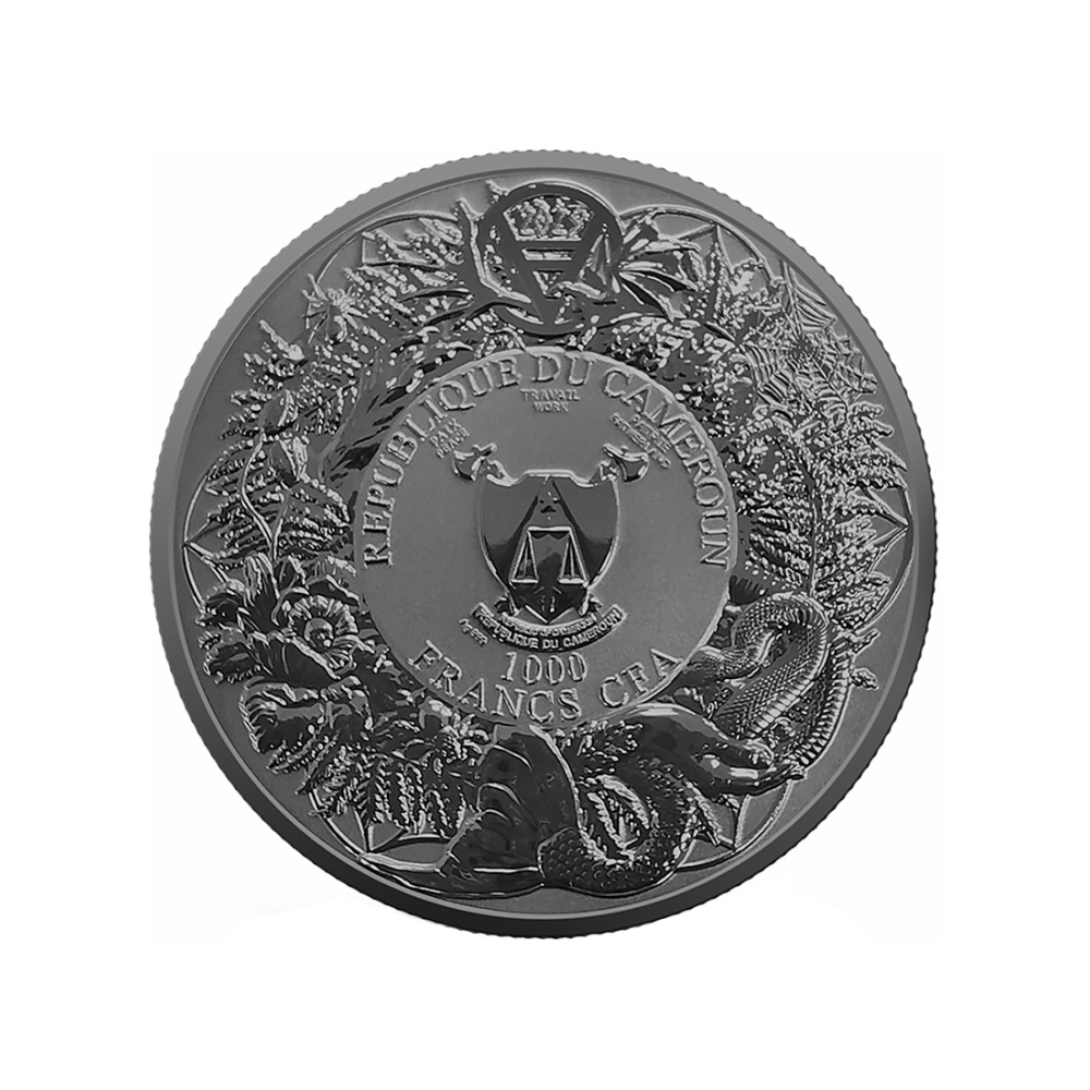 La moneta è stata sottoposta a uno speciale processo di placcatura, una delle tecniche più esclusive di abbellimento numismatico. Il dritto e il rovescio sono rivestiti con rutenio nero, un metallo raro che crea uno sfondo profondo e misterioso.