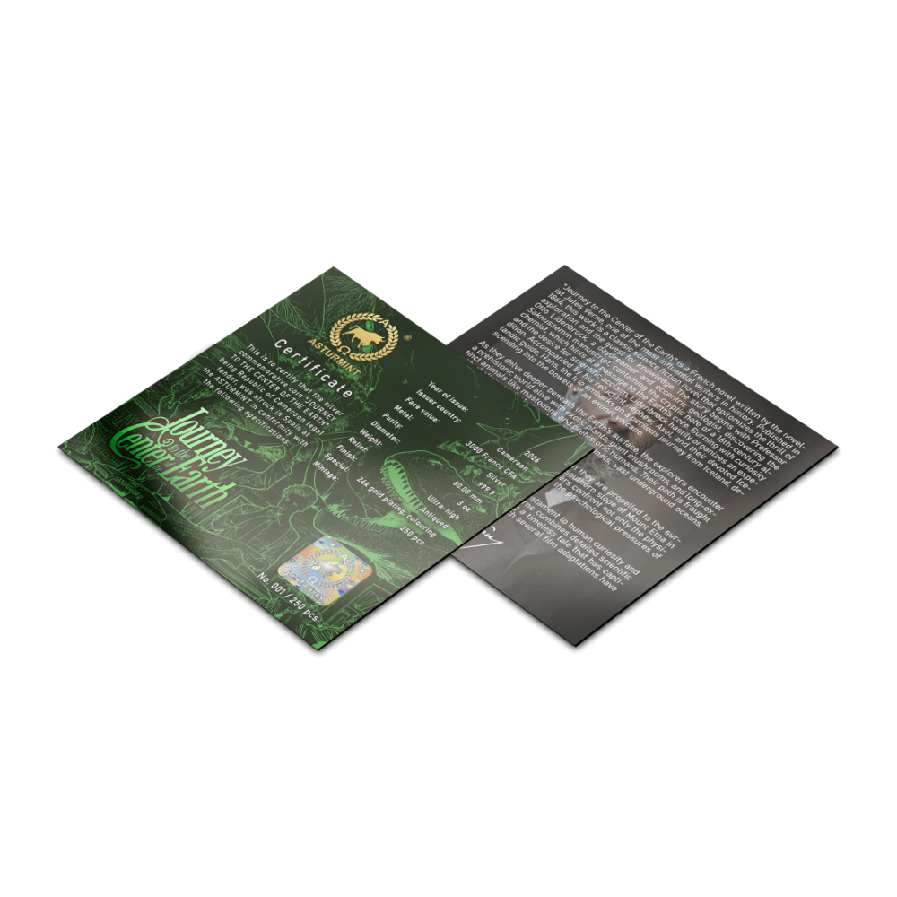 Questa splendida moneta d'argento da 3 once si rifà al romanzo di Jules Verne "Viaggio al centro della Terra". La febbrile ambizione del professor Lidenbrock trascina Axel attraverso oscure vene di paura e meraviglia. L'antica superficie evoca la polvere di antiche grotte. Gli altissimi rilievi si ergono come rocce frastagliate. La doratura selettiva brilla come una scintilla di scoperta. La moneta è contenuta in un cofanetto con certificato di autenticità. Esistono solo 250 esemplari al mondo.