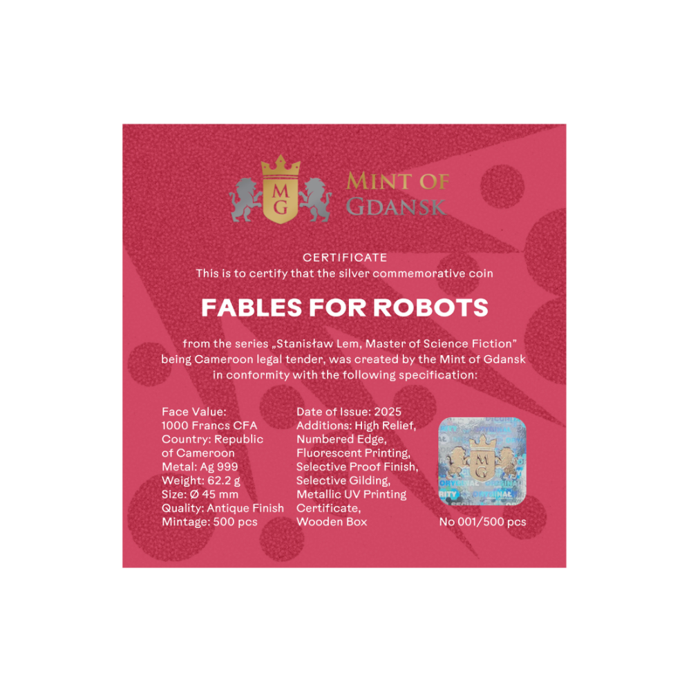 Il rovescio della moneta raffigura un'affascinante scena ispirata al romanzo Favole per robot, una delle opere più famose di Stanisław Lem. Il motivo raffigura una fantastica città robotica ricca di strutture meccaniche monumentali, torri di guardia, mani stilizzate e misteriosi occhi onniveggenti, creando un'atmosfera al tempo stesso futuristica e allegorica. Un'imponente figura robotica con una corona troneggia al centro, guardando un paesaggio urbano geometrico, mentre uno sfondo rosso intenso aggiunge un impatto visivo drammatico.