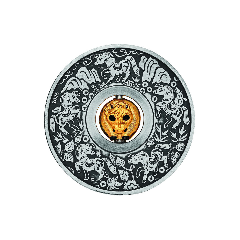Il rovescio della moneta raffigura una perla rotante in argento placcato oro a forma di cavallo. È circondata da cinque cavalli in posizioni diverse, raffigurati nello stile della carta tagliata cinese, incastonati in un fogliame stilizzato. Sono inoltre presenti il marchio di zecca "P" della Perth Mint e l'anno di emissione 2026.