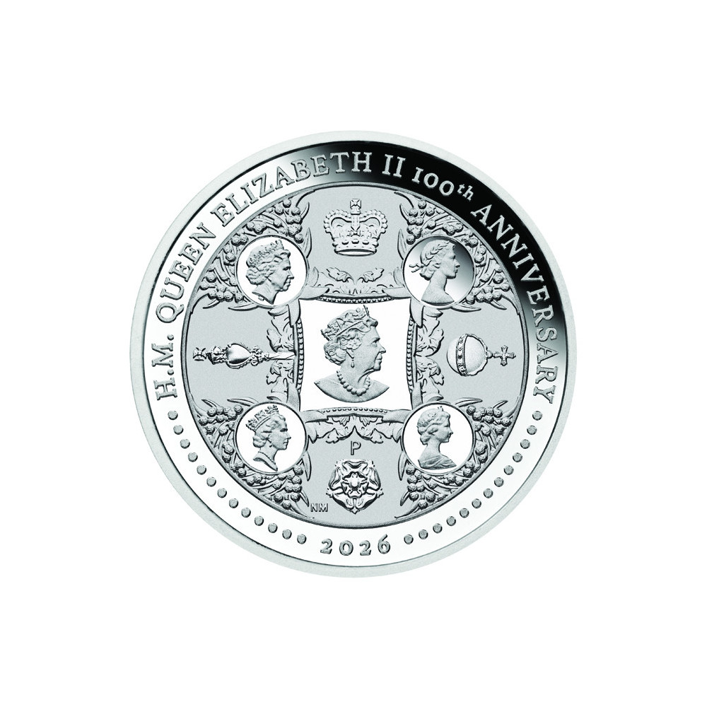 - Una moneta d'argento (7.000 esemplari totali) con cinque effigi della Regina Elisabetta II che rappresentano diversi periodi del suo regno, circondate da vimini d'oro e da regalie reali.