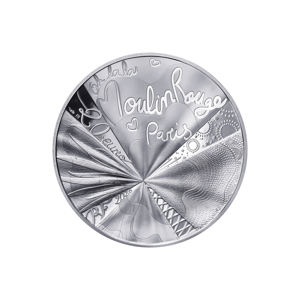 Il rovescio della moneta è composto dalle iconiche ali del Moulin Rouge. Ciascuna parte della moneta fa riferimento a un mestiere artistico: la creazione di costumi, la lavorazione delle piume, il ricamo, la calzoleria e il balletto. Questi si intrecciano con elementi del mondo festoso e spettacolare del Moulin Rouge. L'insieme rende omaggio all'artigianato che contribuisce alla magia del cabaret. La parte inferiore della moneta reca la designazione "RF" e l'anno di coniazione. Nella parte superiore della moneta sono impressi il marchio della zecca di Parigi, Joaquin Jimenez e l'atelier dell'incisore, oltre al taglio.