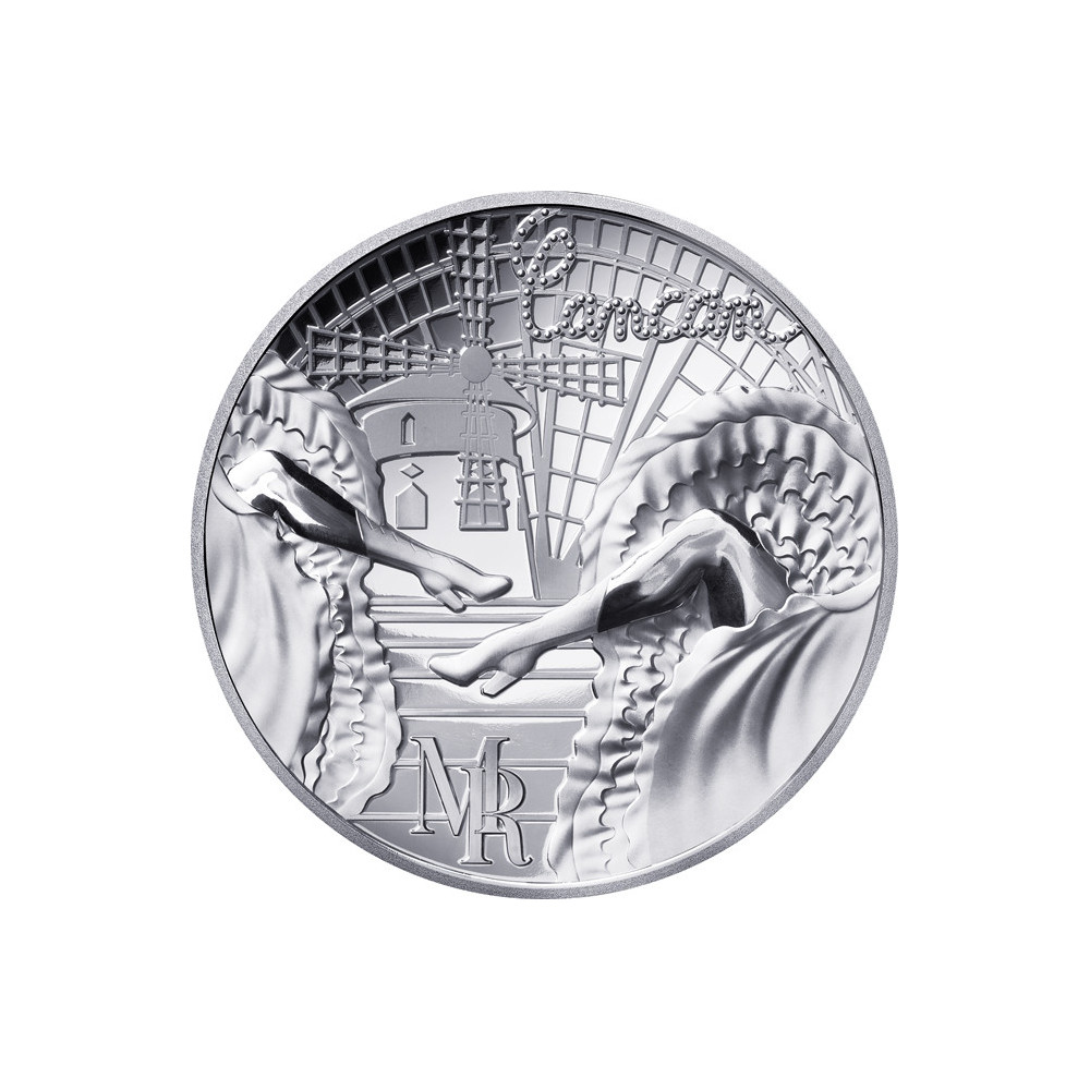 Il dritto della moneta presenta in primo piano due ballerini di cancan francesi, ripresi in un movimento dinamico. Sullo sfondo il leggendario Moulin Rouge, con le sue caratteristiche ali e lo sfondo di un dipinto di cancan francese che raffigura una parte della Torre Eiffel. Le iniziali Moulin Rouge completano il disegno.