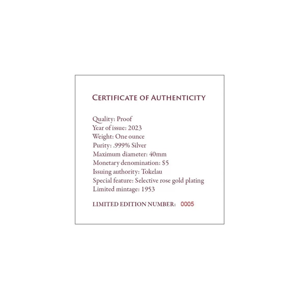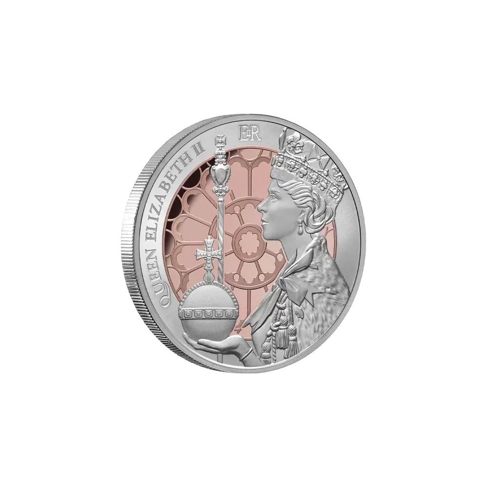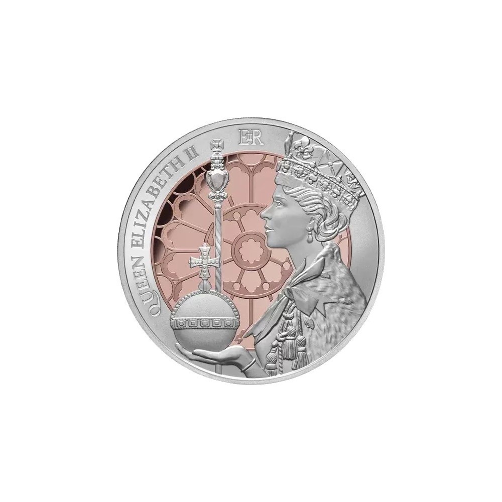Nel giorno della grande parata e dell'antico rituale, Elisabetta II fu incoronata regina il 2 giugno 1953 nell'Abbazia di Westminster a Londra. Nel 2023 ricorre il 70° anniversario di questo evento storico e noi celebriamo questa ricorrenza con una moneta che sicuramente attirerà l'attenzione dei collezionisti reali e numismatici! La maestosa sintesi di 1 oz di argento puro al 99,9% e la placcatura in oro rosa selettivo creano una moneta impressionante ma accessibile! OLa moneta presenta un design significativo e ricco di simbolismi. Il punto focale è la Regina Elisabetta II, che indossa una tunica e una corona imperiale e tiene in mano una mela e uno scettro. Lo sfondo è dominato dalla finestra dell'Abbazia di Westminster, magnificamente decorata e rifinita con morbide e ricche sfumature di oro rosa!