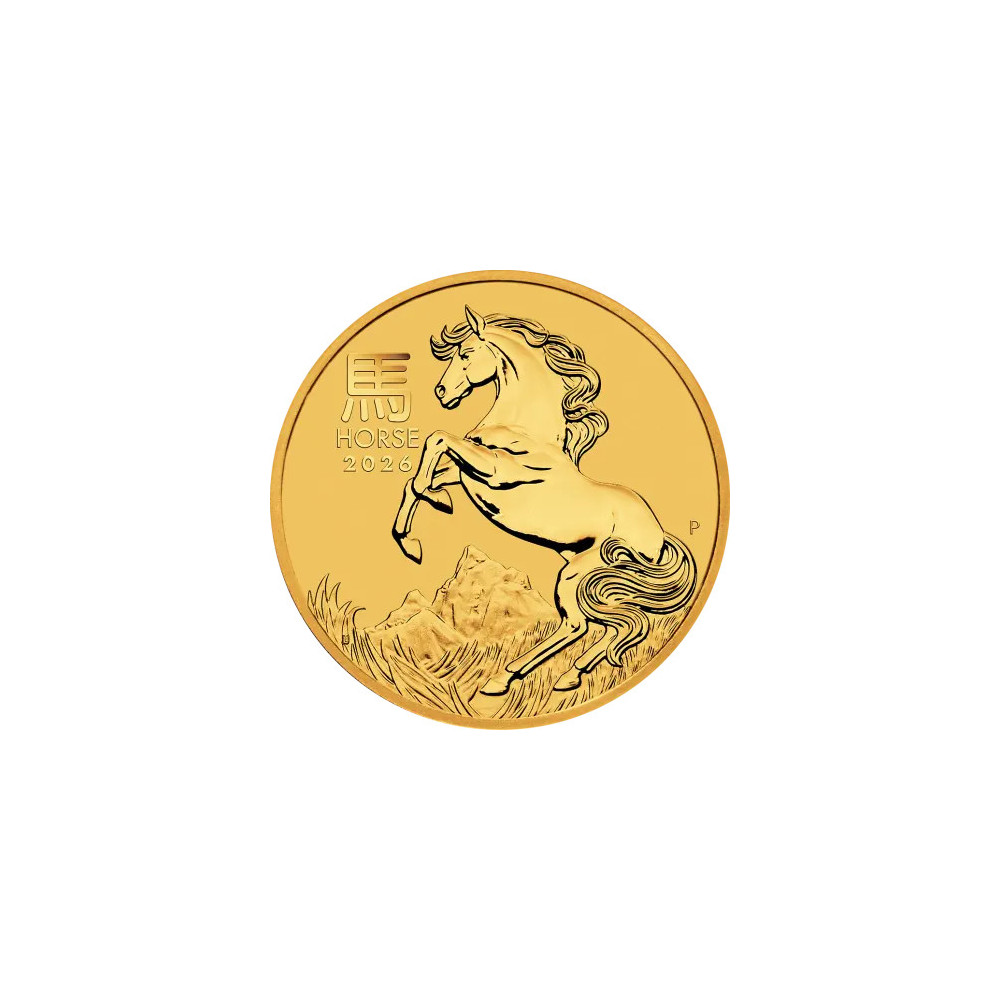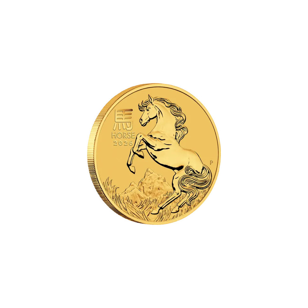Il disegno include il carattere cinese per "cavallo", l'iscrizione "HORSE 2026" e il marchio di zecca "P" della Perth Mint.