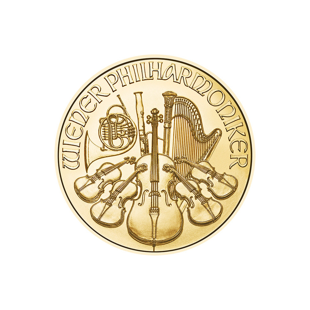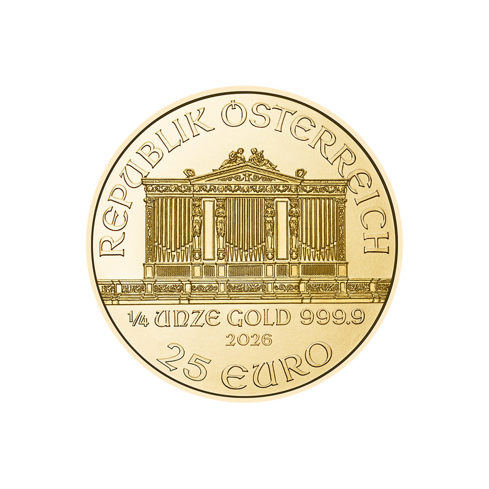 La Filarmonica di Vienna deve il suo nome alla famosa orchestra austriaca, una delle migliori al mondo. Il fronte della moneta d'oro raffigura il grande organo del Musikverein di Vienna. Sotto l'organo sono impressi il peso di 1/4 di oncia, la finezza di 999,9, l'anno di coniazione e il valore nominale di 25 euro. Sopra è impressa l'iscrizione "REPUPLIK ÖSTERREICH". Sul rovescio sono raffigurati alcuni strumenti musicali dell'Orchestra Filarmonica e sul bordo superiore sono visibili il nome dell'orchestra e la moneta d'oro "WIENER PHILHAMRONIKER". Come le monete d'oro di cui sopra, la Filarmonica di Vienna è disponibile nei tagli da 1 oz, 1/2 oz, 1/10 oz e 1/25 oz.