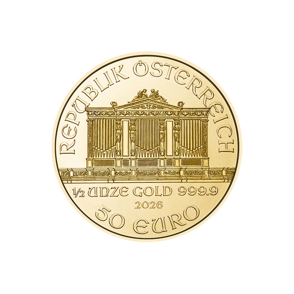 La Filarmonica di Vienna deve il suo nome alla famosa orchestra austriaca, una delle migliori al mondo. Il fronte della moneta d'oro raffigura il grande organo del Musikverein di Vienna. Sotto l'organo sono impressi il peso di 1/2 oncia, la finezza di 999,9, l'anno di coniazione e il valore nominale di 50 euro. Sopra è impressa l'iscrizione "REPUPLIK ÖSTERREICH". Sul rovescio sono raffigurati alcuni strumenti musicali dell'Orchestra Filarmonica e sul bordo superiore sono riportati il nome dell'orchestra e la scritta "WIENER PHILHAMRONIKER". Come le monete d'oro di cui sopra, la Filarmonica di Vienna è disponibile nei tagli da 1 oz, 1/4 oz, 1/10 oz e 1/25 oz.
